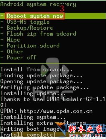 3、最后,选择recovery菜单第一项Reboot system now 来重启手机,整个恢复出厂设置操作就完成了。