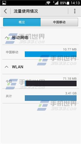 2)点击【流量使用情况】,在【概括】栏可以查看到【移动网络】及【WLAN】的流量使用情况。(如下图)