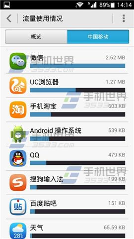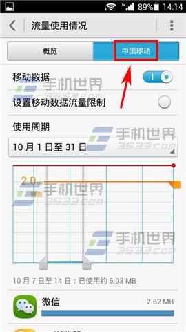 3)点击【中国移动】(小编的移动卡),这里可以看到详细的移动网络使用情况,可按时间段查看,还可设置超流量警告线,下拉还能看到每个应用的流量消耗情况。(如下图)