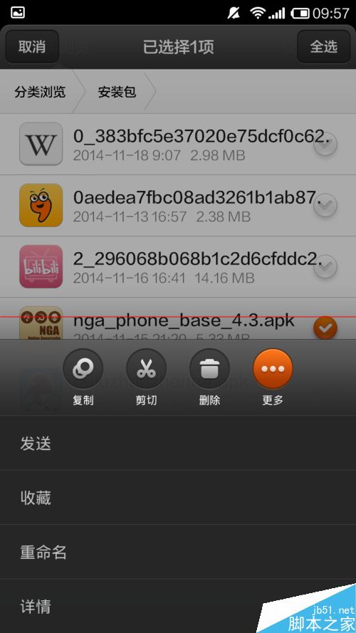3、打开安装包的选项,然后选择一项需要传送的文件,常按此文件即可选中,也可以多选。