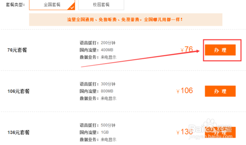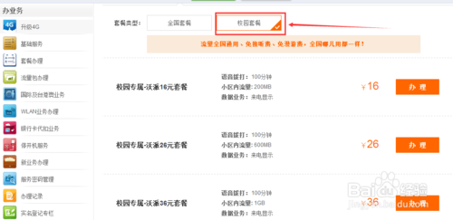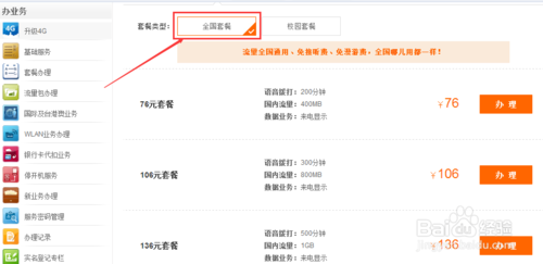2、套餐类型分为全国套餐和校园套餐,点击全国套餐