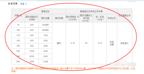 3、就会显示全国套餐的资费标准,在办理前可以事先参考一下资费标准