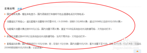 6、每一种套餐列表下,都会有套餐的详细说明以及办理条件,建议事先浏览一下