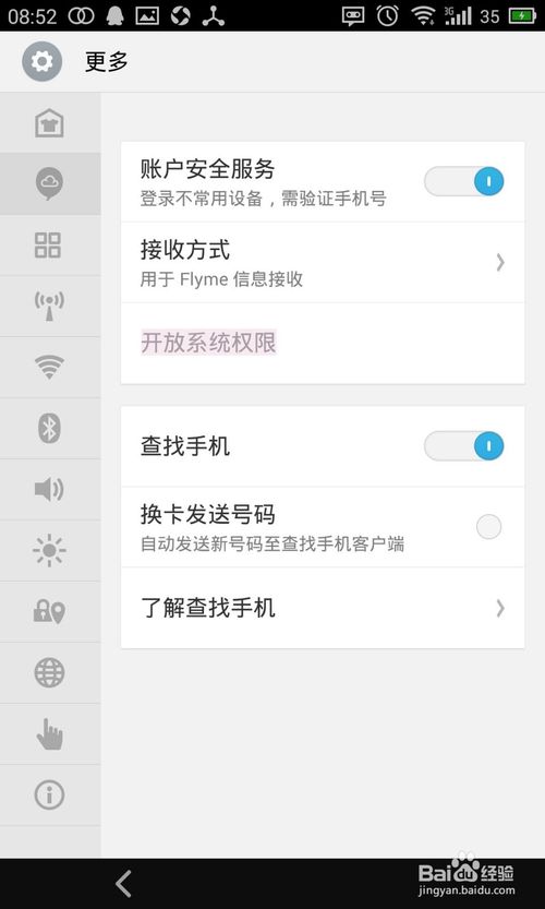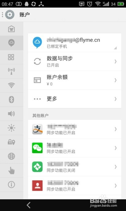1、打开“设置”----“账户”,(如果还没有注册flyme账号,可以到魅族官方网站册一个,也可以在手机使用手机号登陆),如图: