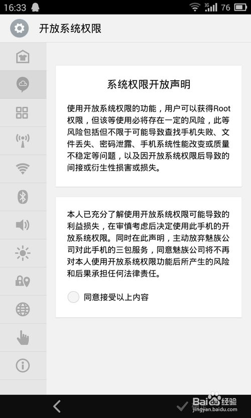 Flyme系统是自带了开放系统权限的功能的,即允许第三方软件获取Root权限,但是大家也要注意开放系统权限以后,有利的方面是:手机的可玩性增大,手机管家们终于可以静默安装程序了,各种以前不能使用的软件功能也可以使用了,另一方面,安全性降低,稳定性变弱,更重要的是你很可能已经放弃了公司的三包政策。国际上大部分手机厂商,包括苹果、三星等都规定不会给ROOT后的手机保修,当然魅族也不例外,J.Wong就曾在微博上表示不会给ROOT后的手机保修,并且会上传手机的唯一识别码和ROOT记录。但也有人ROOT后还享受保修的,那就是福利了。《系统权限开放申请》如图: