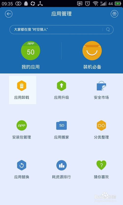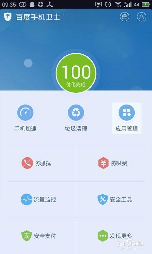 安装百度手机卫士,并打开,如果提示需要ROOT权限,则授权。点击“应用管理”,如图: