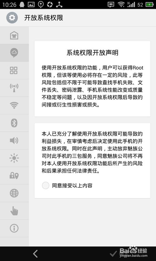 3、点击“开放系统权限”,弹出如下申请窗口。(注:小编在这里提示一下大家,要认真阅读提示窗口内的文字,决定后,选择“同意接受以上内容”,然后点确定。