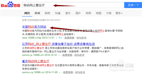 1、在百度搜索栏输入“移动网上营业厅”点击进入移动网上营业厅主页