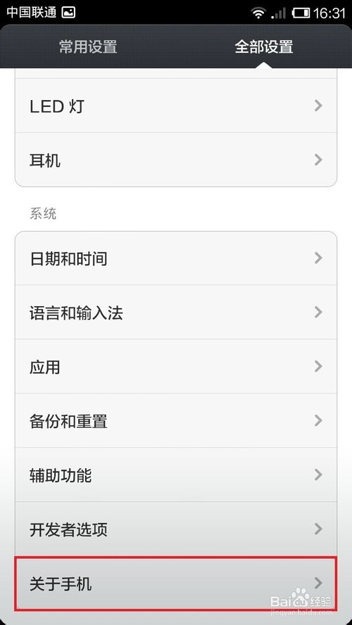 3、在“全部设置”一栏,我们一直往下拉,拉到最下面,我们就能够找到“关于手机”功能按钮。点击进入关于手机信息栏。