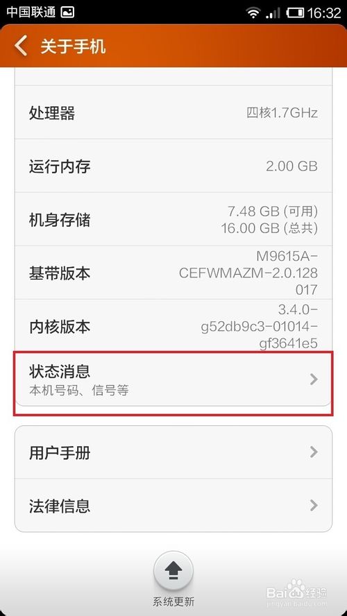 4、我们进入“关于手机”后,在这里我们能够轻松找到“状态消息”功能模块,点击此按钮我们便能够进入状态消息。