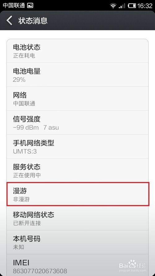 5、当我们进入“状态消息”后,我们就可以在状态信息里去找到漫游一项,如下图,我们可以轻松判断实际正在使用的手机信号是否处于漫游状态。