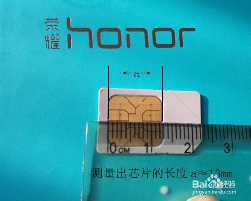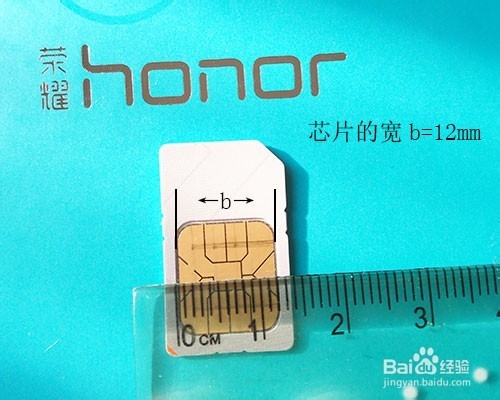 把SIM卡放在平坦的桌子上,测量出芯片的长度a,约为13mm,芯片宽度b=12mm
