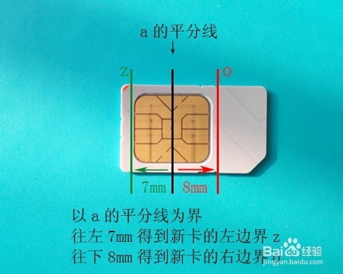 a的一半是6.5mm,画一条垂直于a的平分线,然后以该平分线为界,往左找7mm,画一条平行于短边的线z,往右找8mm,画一条平行于短边的线o,这两条线就是新卡的两个边。