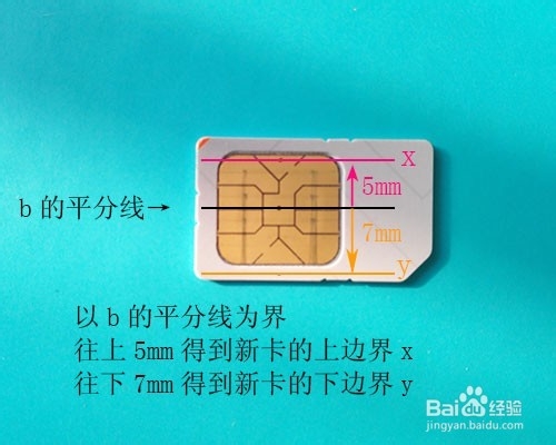 b的一半是6mm,画一条垂直于b的平分线,然后以该平分线为界,往上找5mm,画一条平行于长边的线x,往下找7mm,画一条平行于长边的线y,这两条线就是新卡的两个边。