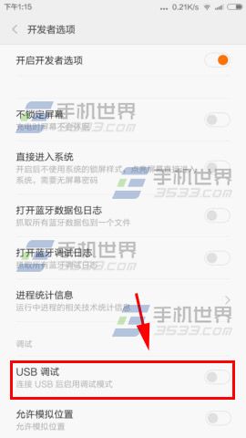 3)点击【开发者选项】,勾选【usb调试】即可。(如下图)
