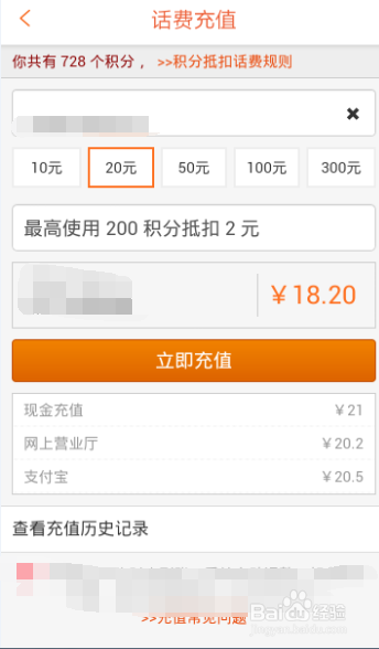 在这里大家可以看到我有700多积分,积分每天签到领取,可以看到10元的话费只需要支付8元,但是20元的就需要18.2元,50元的就需要47.5元。