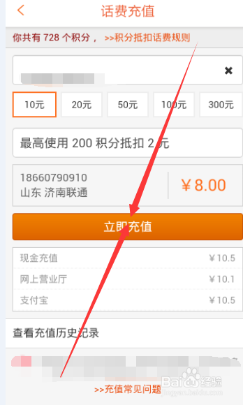 从步骤三可以了解到,只有10元的话费最实惠,8折啊,太便宜了。点击到10元话费充值,点击立即充值,跳转到新的界面,点击确定。