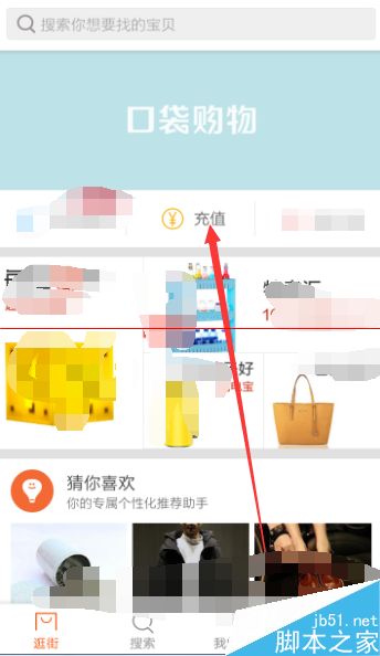 2、打开口袋购物后,会看到最上面的中间部分有一个充值窗口,在这里说明一下,充值是需要积分抵扣的,如果刚刚申请的可能不行,所以需要大家每天都要签到积分,然后点击进去,会出现第二幅刷新窗口,然后进跳转到步骤三的第一幅图。