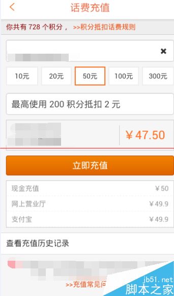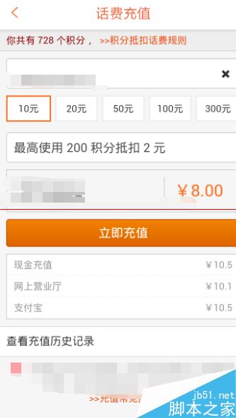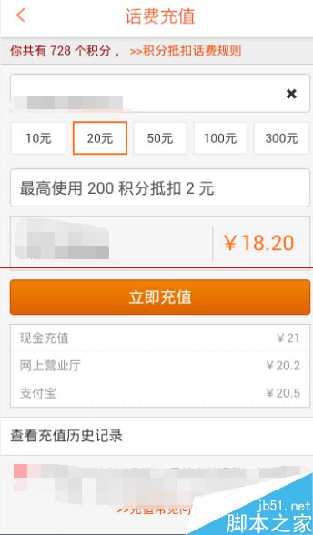 3、在这里大家可以看到我有700多积分,积分每天签到领取,可以看到10元的话费只需要支付8元,但是20元的就需要18.2元,50元的就需要47.5元。