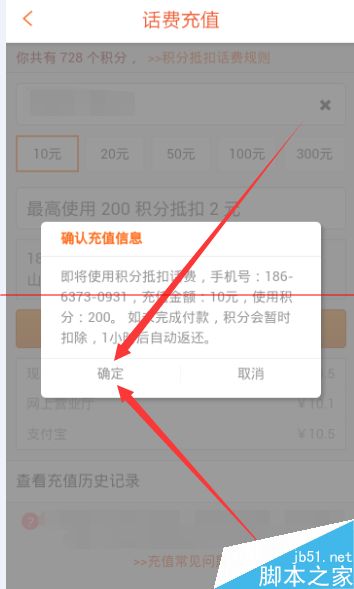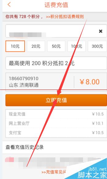 4、从步骤三可以了解到,只有10元的话费最实惠,8折啊,太便宜了。点击到10元话费充值,点击立即充值,跳转到新的界面,点击确定。