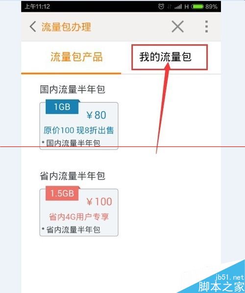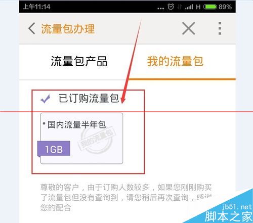 5、点击【我的流量包】后会显示你已订购的流量包:国内流量半年包1GB,如图所示