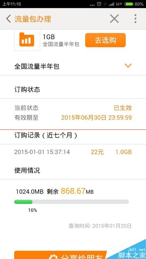 6、点击该流量包的图标,页面就会显示流量半年包的订购状态和使用情况,如图我的1GB流量还剩868.67MB。