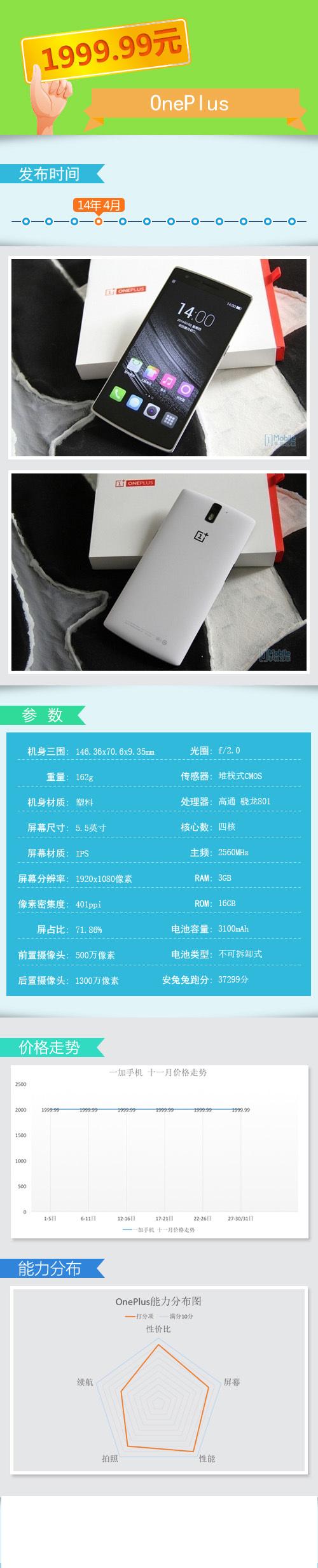 一加手机在双十一放出的大招就是:不降价。好吧,还真是有种卖萌的嫌疑。这么看来双十二一加手机应该还是会不妥协的将价格固定在1999.99这样一个精确的数字上。充足的货源是一加手机最大的优势,白色Babyskin版本开放购买,竹制和磨砂黑版本也相对容易购买,到现在依然是旗舰级别配置的一加手机不失为一个购机的好选择。
