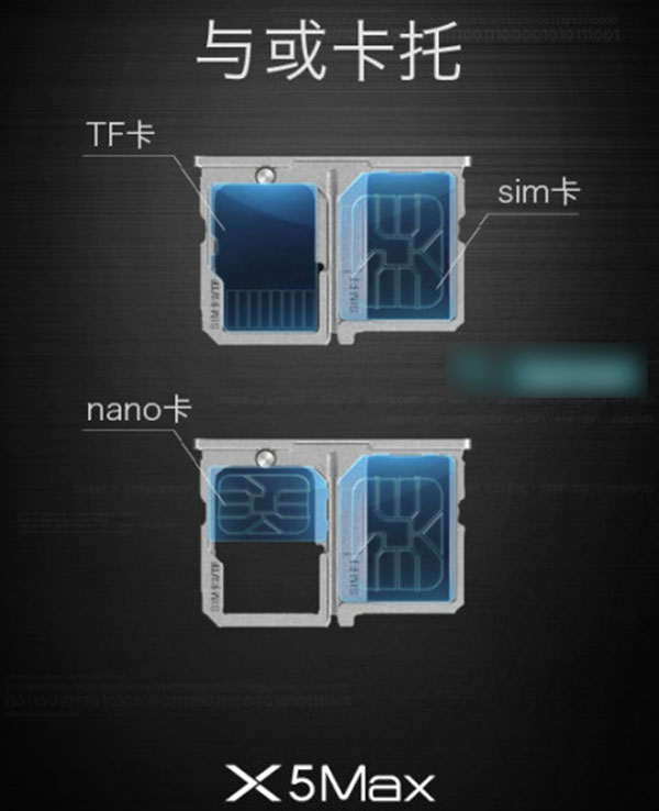 首先vivo X5Max是支持双卡双待的,此次采用了与或卡托,与或卡托设计分为主卡与副卡两个卡槽,主卡位置仅可以放置Micro-SIM卡,副卡位置可以放TF扩展卡也可以放nano-SIM卡来实现双卡双待功能,换句话说vivo X5Max既可以是一台支持TF卡拓展的极致Hi-Fi手机,又可以是一台双卡双待的极致Hi-Fi手机。如下图所示: