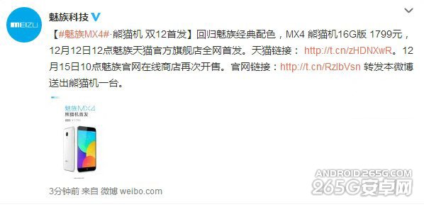 就在刚刚,魅族在微博宣布,魅族MX4熊猫机将于双12在天猫商城首发,于12月15日在魅族官网在线商店再次开售,16GB版1799元、32GB版1999元。