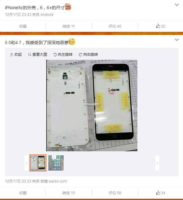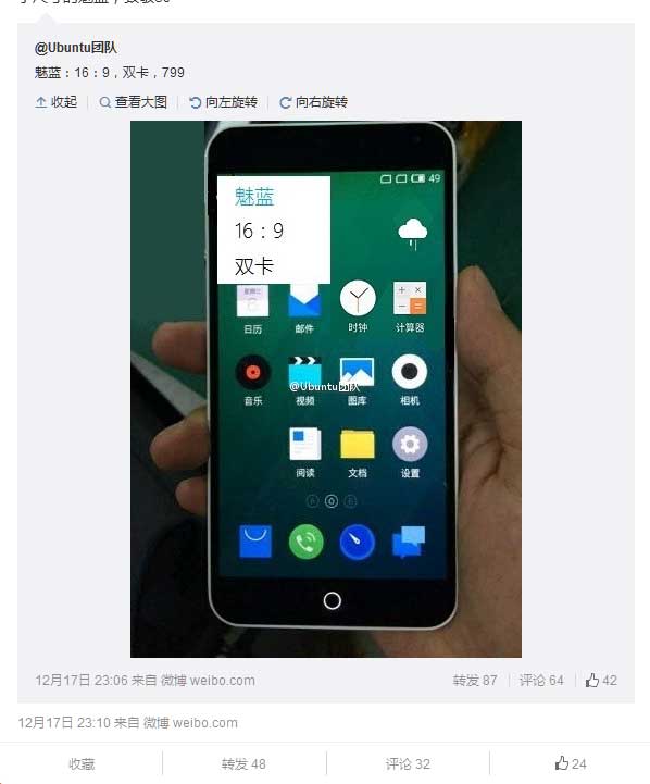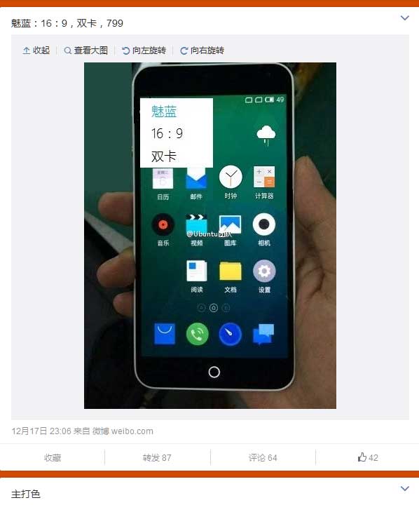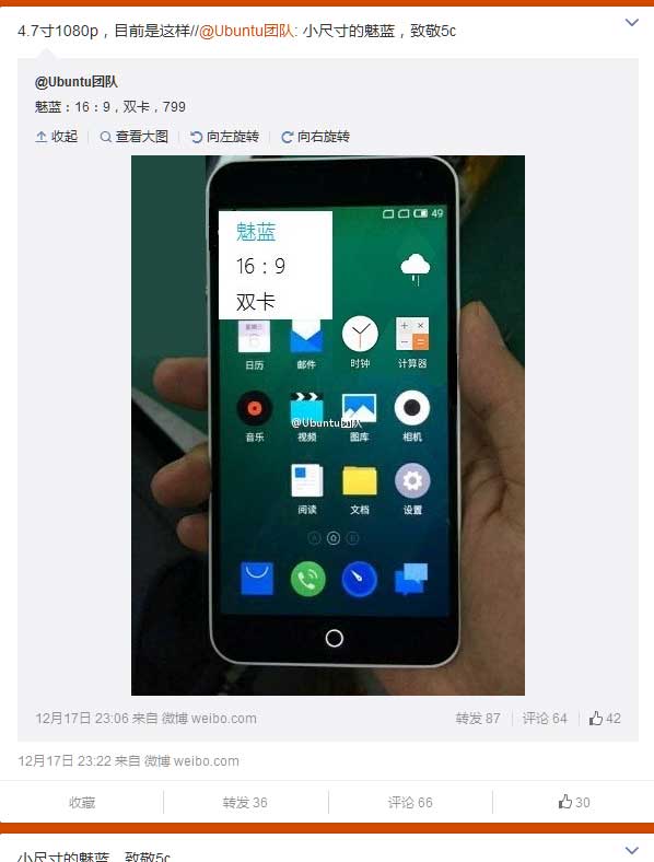 日前魅族发出“no blue”(谐音‘魅(没)蓝’)邀请函定于今年12月23日在北京国家会议中心召开新品发布会,届时除了备受期待的千元机魅蓝手机亮相之外还可能推出移动电源等相关产品。随着发布会临近,此前曾多次曝光魅族新机的微博帐号@Ubuntu团队再次分享了魅蓝的相关消息,称魅蓝将会采用iPhone 5C的塑料外壳,但是会装备同iPhone 6、iPhone 6 Plus相同的4.7英寸和5.5英寸两个版本。4.7英寸采用16:9比例,支持双卡双待,售价为799元。