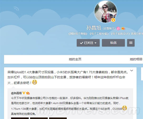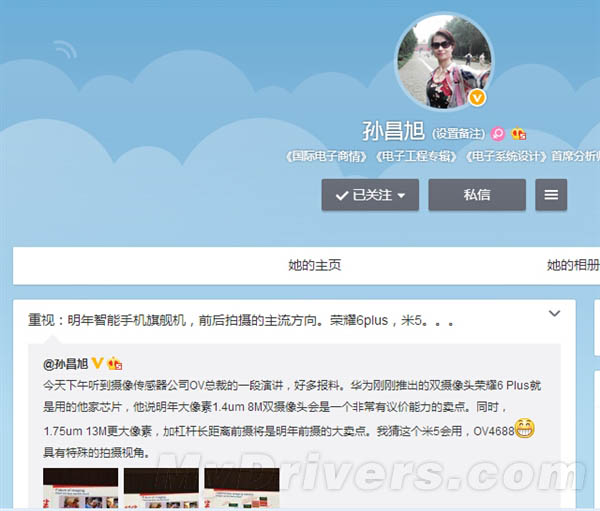 现在业内分析师孙昌旭在微博上爆料,华为荣耀6 Plus采用的1.4um双800万像素摄像头出自OV公司,另外小米5的前置摄像头同样可能出自该家公司,为1.75um 500万像素。