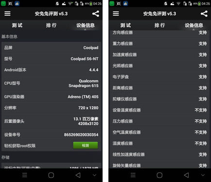 在测试跑分之前,我们再来看看ivvi S6硬件配置参数。采用5.5英寸720P的AMOLED显示屏,搭载了高通骁龙615八核64位处理器,主频为1.2GHz,内置2GB内存+16GB机身存储,并支持MicroSD卡扩展;采用了一颗1300W像素的摄像头,拥有f/1.8超大光圈,同时支持插值状态下的5000万超像素拍照,前置摄像头为800万像素,单像素尺寸为1.4微米。机身厚度为5.5mm,整体较为轻薄。电池容量2000毫安时,同时支持5模双4G双卡双待,且兼容三个运营商的三种4G制式,是4G全网通。通过安兔兔V5.3跑分测试,其成绩如下。