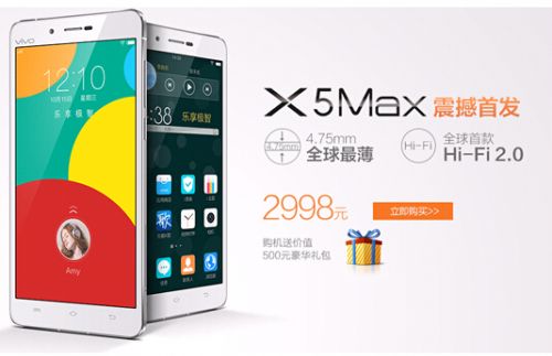 前阵子关于最薄手机的争夺战在国产厂商展开,vivo再次刷新了全球最薄手机的记录:发布了厚度仅4.75mm的全球最薄智能手机vivo X5Max,该机除了精致的外观之外,还搭载了全新的Hi-Fi架构——Hi-Fi 2.0,是目前音质最好的Hi-Fi手机。目前该机已经正式首发销售,在vivo天猫旗舰店、官方商城、京东商城等多网络平台,售价2998。