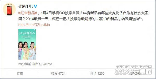 红米手机今天在官方微博发布了最新消息,红米手机将于1月4日发布新品,并通过手机QQ发布。