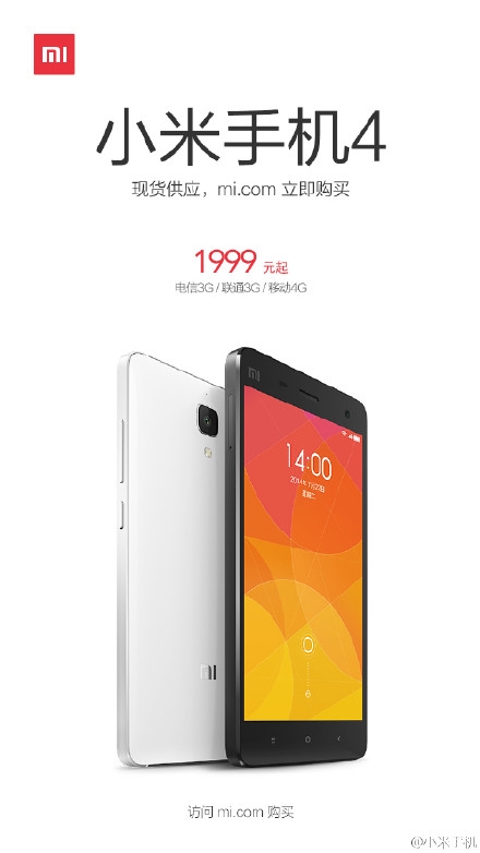 来自小米官方微博:“现货供应!#小米4#直接买”好消息!小米4敞开销售,电信3G/联通3G/移动4G版可选,1999元起。不锈钢全金属边框,工艺和手感超乎想象;全球顶配性能王者:高通骁龙801四核2.5GHz处理器,3GB的LP-DDR3大内存;好看&好用的MIUI 6系统!赶快转发将好消息告诉小伙伴们。