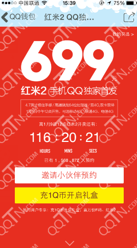 2、在活动页面,可以直接预约红米2,然后充值1Q币开启礼盒,有机会赢取万份F码、红米2等奖品。
