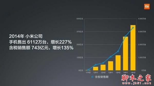 小米在2015年的第一个工作日推出了第一款新品红米手机2,同时雷军也在微博上声情并茂地总结了过去的2014,小米公司在2014年共销售了 6112万台手机,增长227%;含税收入 743亿元,增长135%。因为还未上市,所以年报的准确性无法保证,但结合第三方机构的统计数据,这个数字应该基本无差。