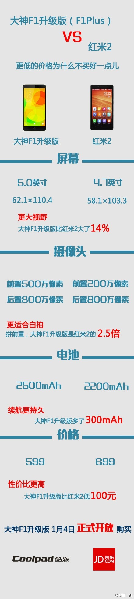 昨日,小米联合腾讯QQ发布了新一代的红米手机:红米2,紧接着酷派大神也发出消息,大神F1升级版大神F1 Plus移动版开放购买,无需预约。最重要的是价格只要599!比红米2便宜了一百块,看来是要跟红米2死磕啊。