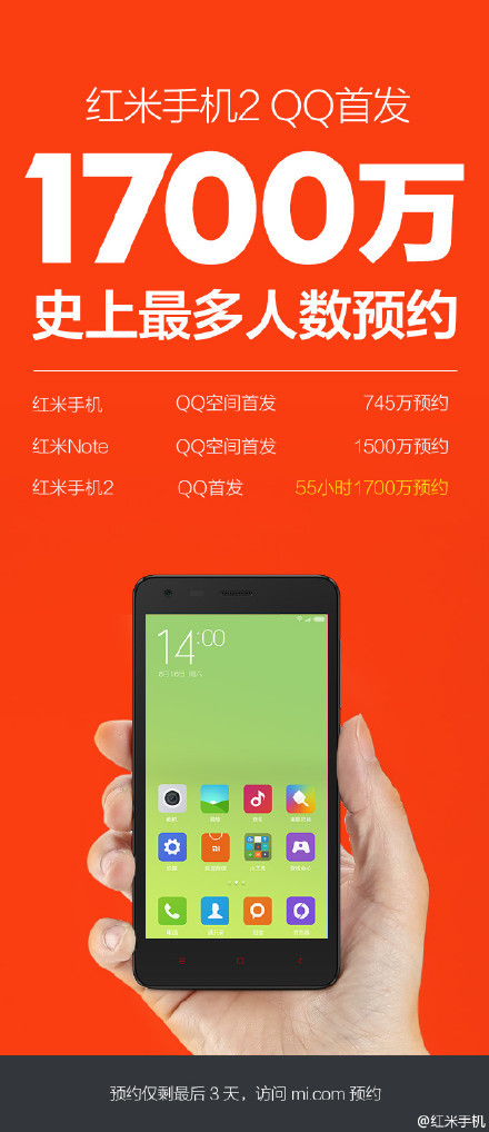 自从红米2手机1月4日在QQ首发后,其预约情况十分火爆,昨日下午18点19分,红米手机官方微博宣布,红米手机2开启预约仅两天内,预约量已经达到1700万,达到“史上最多预约人数”。