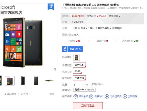1月8日Lumia 930流金典藏版已经在微软中国官方天猫旗舰店正式上线,并独家开启限量预售,首发数量为3000台。这款手机的预售价为2899元,预订需要支付500元订金,同时还有多重好礼相送。
