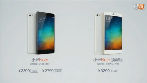 小米Note的16GB售价为¥2299元,64GB为¥2799。