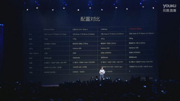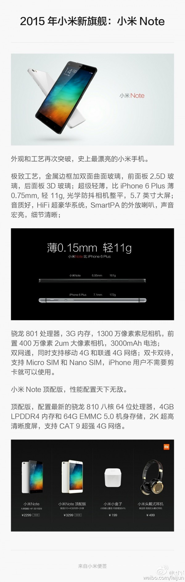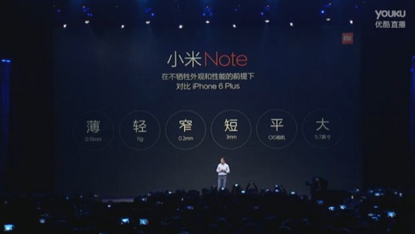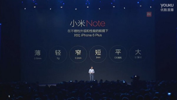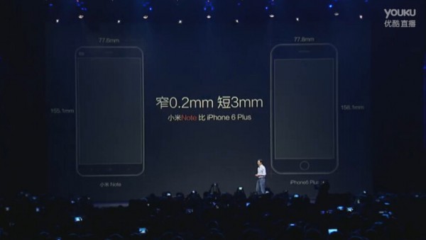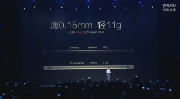 小米Note,比iPhone 6 Plus薄0.15mm,轻11克。