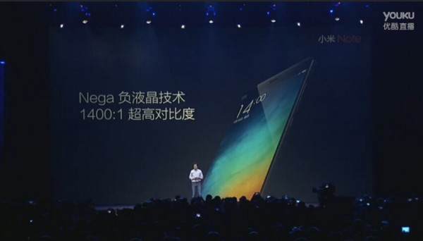 大屏幕上展示着各种角度下的小米Note,黑色白色版。