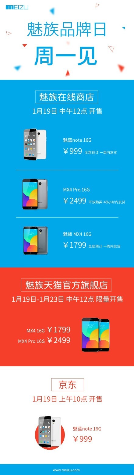面对小米Note这款新机发布引发的热潮,昨日在官方微博宣布,下周一(1月19日)为魅族品牌日,魅族MX4 Pro(16GB版)、魅族MX4(16GB版)以及魅蓝note(16GB版)将在魅族官方商城、天猫旗舰店以及京东商城开售。其中MX4 Pro现已开放购买,并承诺将于48小时内发货,魅族MX4与魅蓝note均会在一周之内发货。
