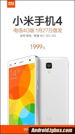小米手机官方宣布,小米4的电信4G版将于1月27日中午12点首发,之后每周二开放购买,7日内发货,价格依然是1999元。