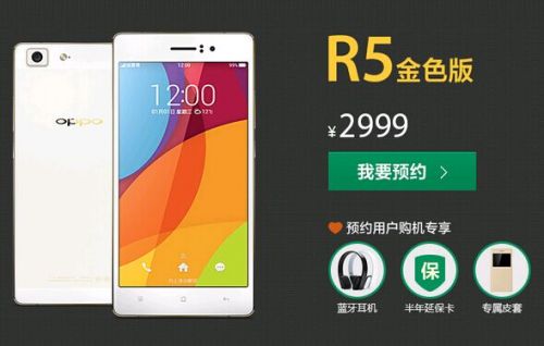 R5金色版的价格保持了2999元,预约用户抢购可以得到蓝牙耳机、半年延保以及专用皮套的礼包。