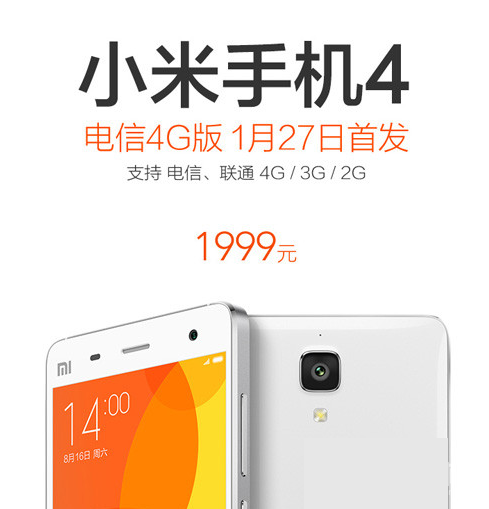 小米手机4电信4G版马上就要上市了,1月27日电信4G版首发,售价为1999元。