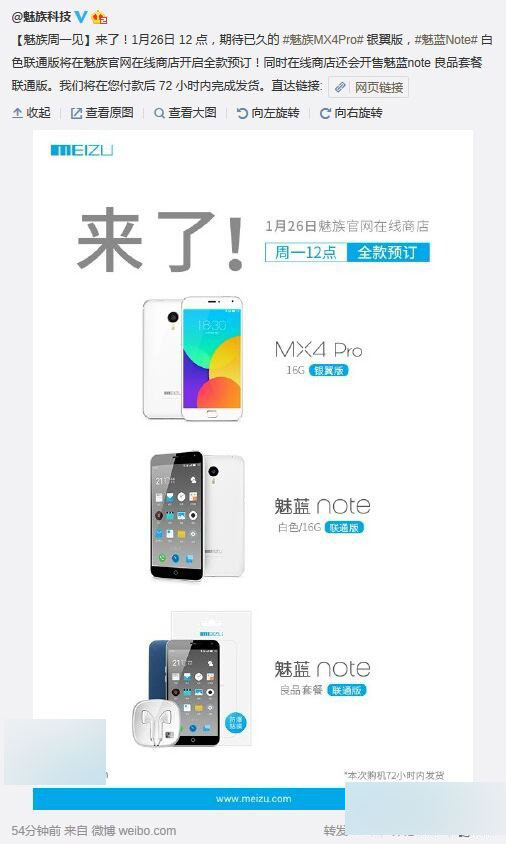 魅族科技官微表示,1月26日中午12点,魅族MX4 Pro银翼版、魅蓝Note白色联通版将在魅族官网在线商店开启全款预订。同时,魅族还会开售魅蓝Noe良品套餐联通版。并且保证付款后72小时内完成发货。