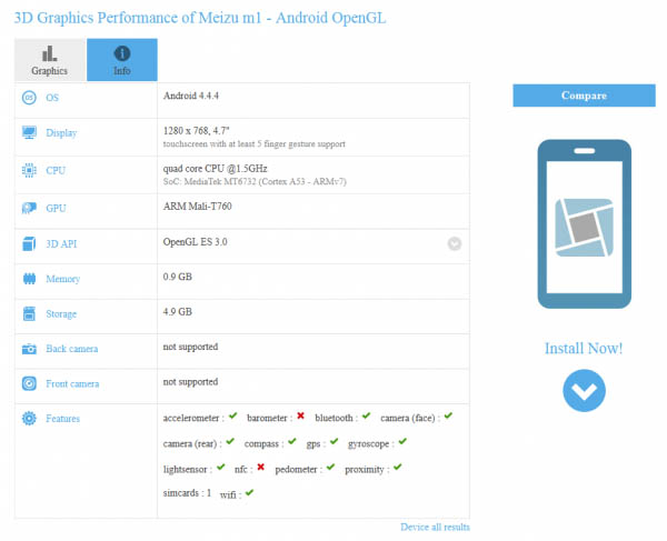 从曝光的配置来看,该机配备4.7英寸1280×768分辨率显示屏,并非传闻中的5英寸,采用64位Cortex-A53架构的MT6732四核1.5GHz处理器(GPU为Mali-T760),内置1GB内存和8GB机身存储,摄像头暂时还没有识别出来。