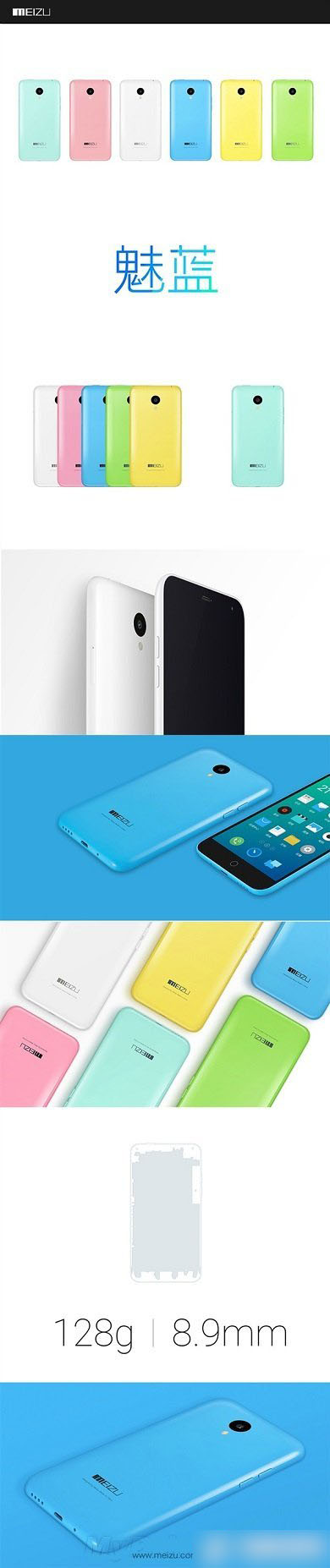 魅蓝手机有六个个颜色可选,分别是:白色、淡粉色、蓝色、淡蓝色、黄色、绿色六种。售价为699元,预计2月5日正式上市。